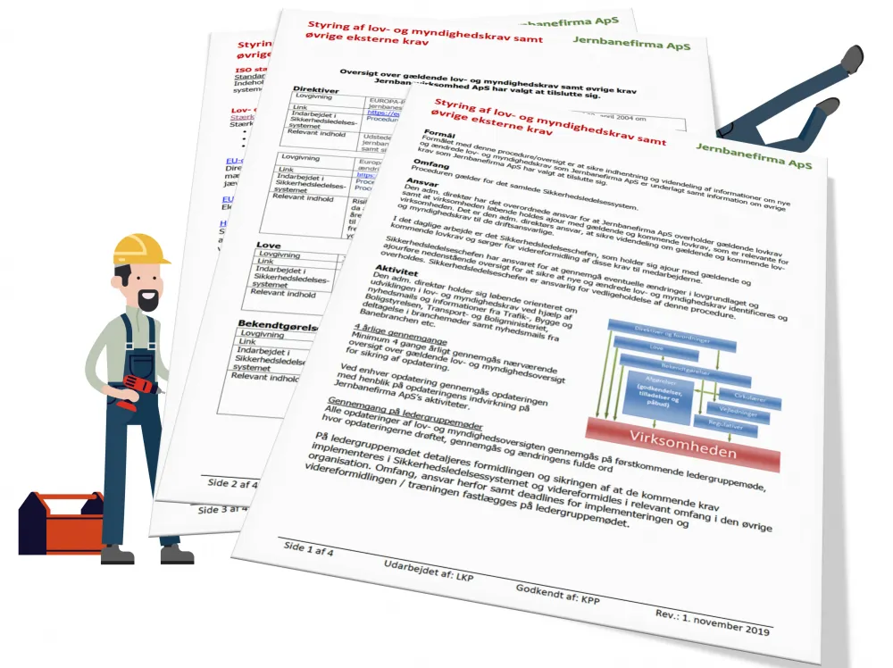 I skal i sikkerhedsledelsessystemet løbende kunne fremvise dokumentation som beviser, at lovgivningens krav, jeres egne krav samt andre krav, er opfyldt. Det kan f.eks. være krav fra infrastrukturforvaltere eller krav om vedligeholdelse af materiel. Der må ikke være tvivl om sikkerheden og kvaliteten i jeres udførelse af opgaverne. I skal løbende udarbejde dokumentationen og efterfølgende arkivere den, så I altid kan genfinde dokumentationen.