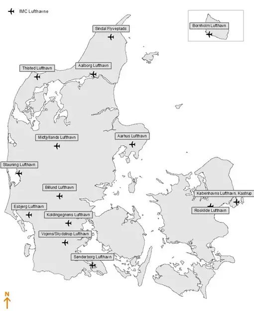 Nedenstående figur 4 viser flyvepladser i Danmark. Der skelnes i figur 4 mellem offentlige instrumentflyvepladser (IMC-flyvepladser4) og offentlige visuelle flyvepladser (VMC-flyvepladser5). De private flyvepladser er ikke vist, eftersom de ikke er omfattet af reguleringsmodellen.