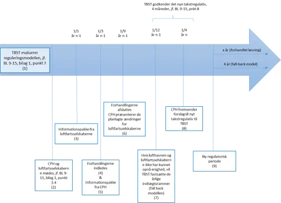 Taksterne i Københavns Lufthavne A/S skal være fastsat i overensstemmelse med reguleringsmodellen i BL 9-15. Takstfastsættelsen sker i videst muligt omfang efter aftale mellem lufthavnen og lufthavnsbrugerne. Ved fastsættelsen af taksterne skal lufthavnen og de faste lufthavnsbrugere først ved forhandling søge at opnå enighed om taksterne for den kommende reguleringsperiode. Hvis dette ikke er muligt, fastsætter Trafikstyrelsen de årlige indtægtsrammer, som udgør det maksimale samlede beløb, som lufthavnen kan anvende som grundlag for fastsættelsen af taksterne, den såkaldte ”fall back model”. Figur 3 viser tidslinjen for takstforhandlingerne.