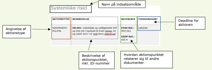 I EPAS er der en række aktionspunkter, herunder ”Member State Tasks” (MST), som er direkte aktionspunkter for medlemsstaterne. Disse aktionspunkter afspejles direkte i denne PAS, såfremt de vurderes at være relevante for sikkerhedsarbejdet i Danmark. Derudover har EASA i EPAS også fokus på flere strategiske faktorer, som har stor indvirkning på luftfarten. To af EASA’s strategiske prioriteter er miljø og klima. Her arbejder EASA sammen med Den Europæiske Kommission henimod en mere bæredygtig luftfart. Dette væsentlige arbejde støtter Trafikstyrelsen op om.
