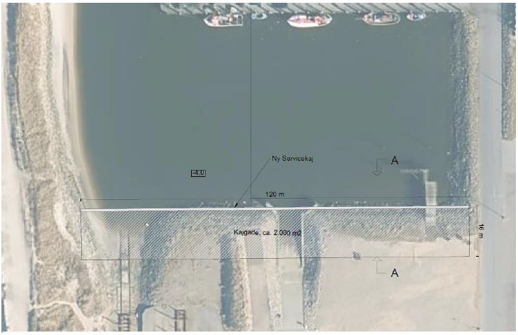 Servicekajen etableres i tracéet af eksisterende stenkastning og slæbested, der ikke længere anvendes. Kajen etableres med en samlet længde på 120 meter inkl. 20 meter fløjspuns i overgangen mellem land og vand, se figur 2. Eksisterende sten i skråningen opgraves og køres til depot. De eksisterende slæbesteder nedbrydes, hvis muligt knuses beton, hvorefter det indbygges i baglandet. Kajvæggen opbygges i stålspuns og forankres til ankervæg i bagland. Kajvæggen afsluttes med en betonhammer. Supplerende sand til indbygning bag nye anlæg er rene friktionsmaterialer fra grusgrav. Stålspunsen til lejet og fløjvæg installeres med ramme-maskine fra land.