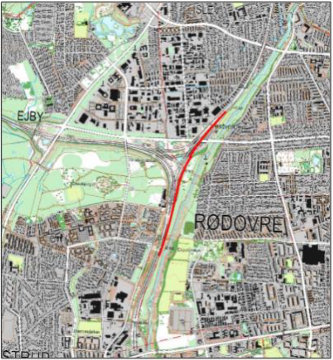 Oversigtskort over støjskærmen langs M3 ved Rødovre