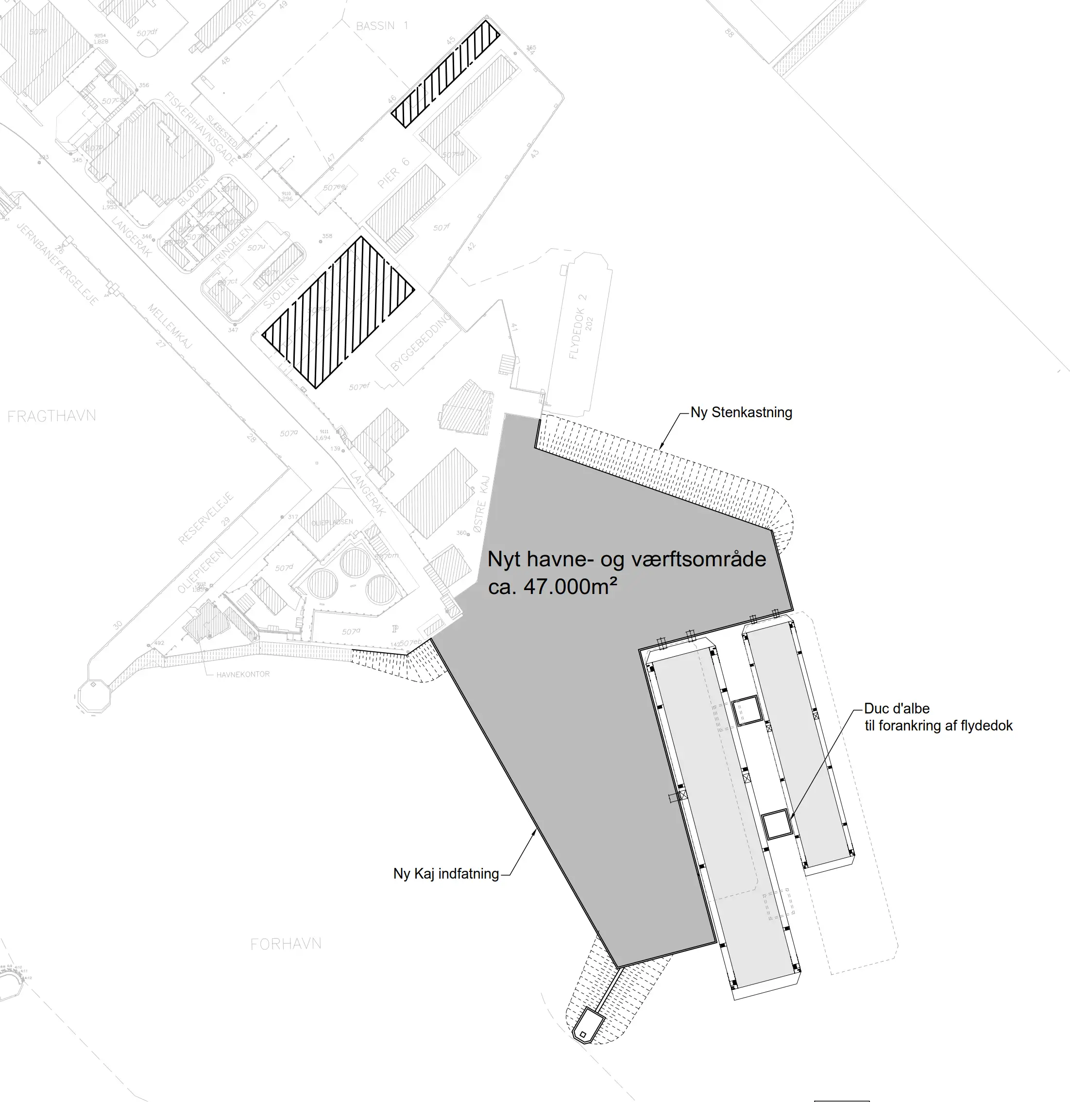 Projektet indebærer et nyt havne- og værftsareal på ca. 47.000 m2, der etableres i eksisterende havnebassin ved opfyldning af havnebassin og nedrivning af eksisterende Nordre Mole, en lager- og værkstedsbygning på op til 5.000 m2 samt to flydedokke ved havne- og værftsområdet, der vil kunne modtage ca. 50 skibe årligt. Den største af de nye flydedokke bliver ca. 250 x 50 meter og får en højde på 15 meter. Den anden flydedok bliver ca. 180 x 37 meter og får en højde på 11 meter.