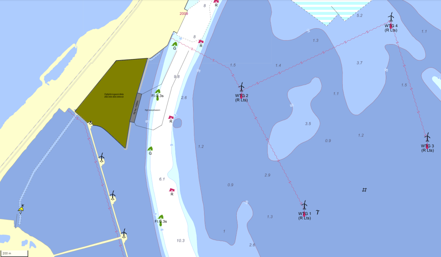 Der uddybes til 10,0m foran den nye kaj. Der forventes opgravet ca. 60.000m3 materiale som overvejende er ler som skal klappes.