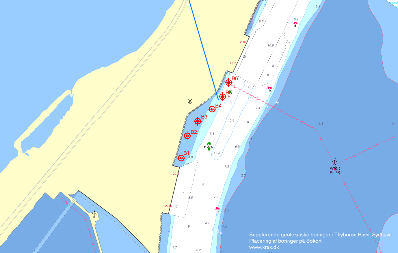 Da Thyborøn Havn skal udvide Sydhavnen, skal der i den forbindelse udføres supplerende boringer i området og der skal i alt laves seks boringer på vand til kote -24. Boringerne udføres fra borerig på flåde med Jack-up. Varigheden af de geotekniske boringer anslås til en uge. Boringerne forventes at blive udført i perioden 15. august til 15. september 2024. Anlægsarbejdet udføres i tidsrummet 07-18.