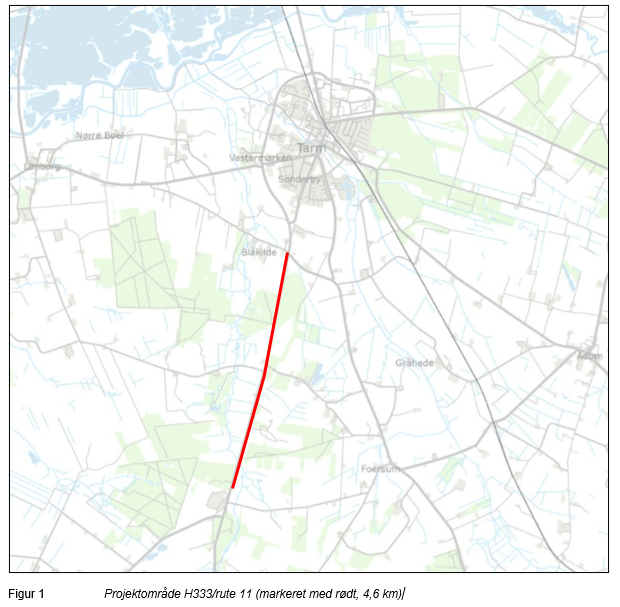 Trafikstyrelsen har den 5. september 2025 modtaget ansøgning fra Vejdirektoratet om midlertidig sænkning af grundvandet ved etablering af 6 grøftebassiner i forbindelse med anlæg af en dobbeltrettet cykelsti nord for Egvadvej til Brosbølvej (H333/Rute 11) syd for Tarm i Ringkøbing–Skjern Kommune.